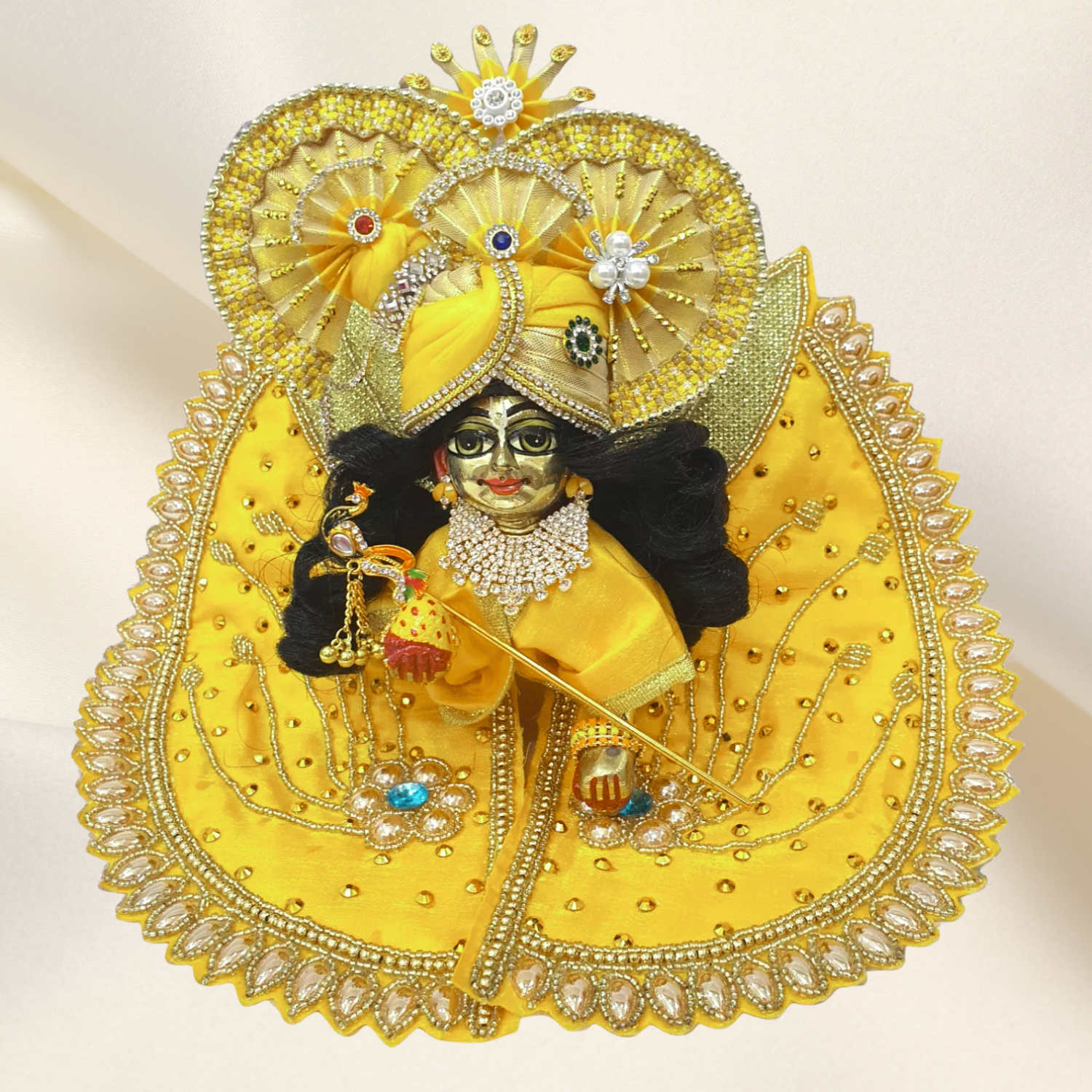 Yellow Floral Designer Dress For Laddu Gopal Ji With Pagdi